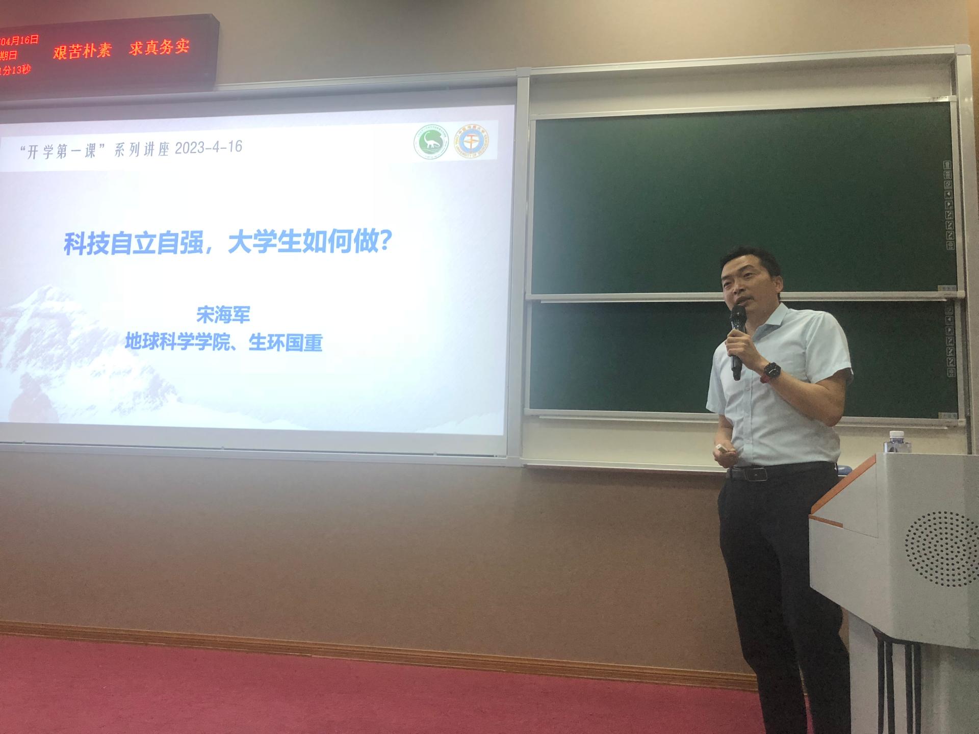 4月16日晚,第十七届“中国青年科技奖特别奖”获得者、永利集团88304官网集团地球生物学系教授、生物地质与环境地质国家重点实验室副主任,“挑战杯”大学生课外学术科技竞赛优秀指导老师宋海军教授以“科技自立自强,大学生该如何做”为题,为永利官网2022级本科生带来了一场精彩的主题报告。