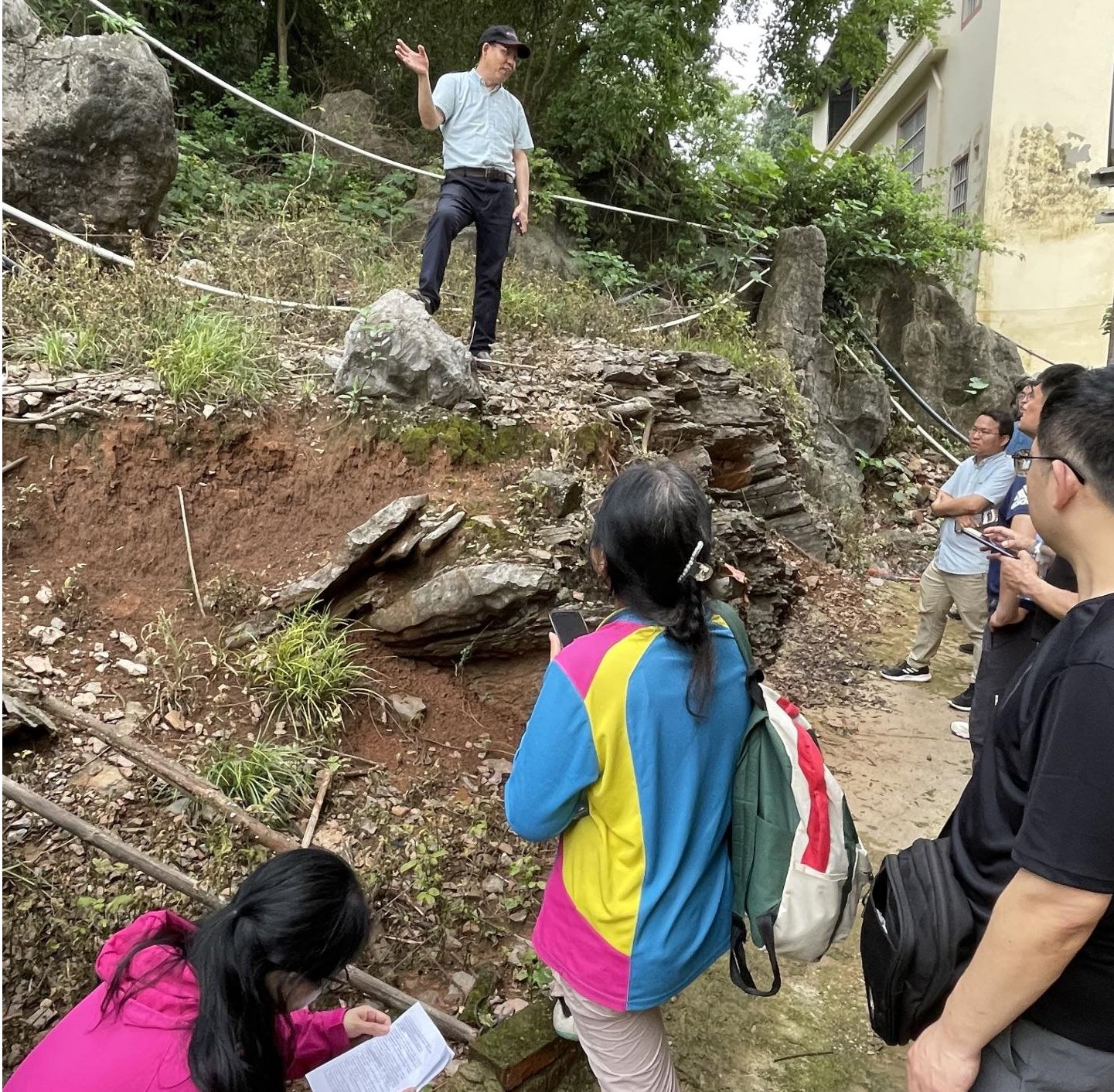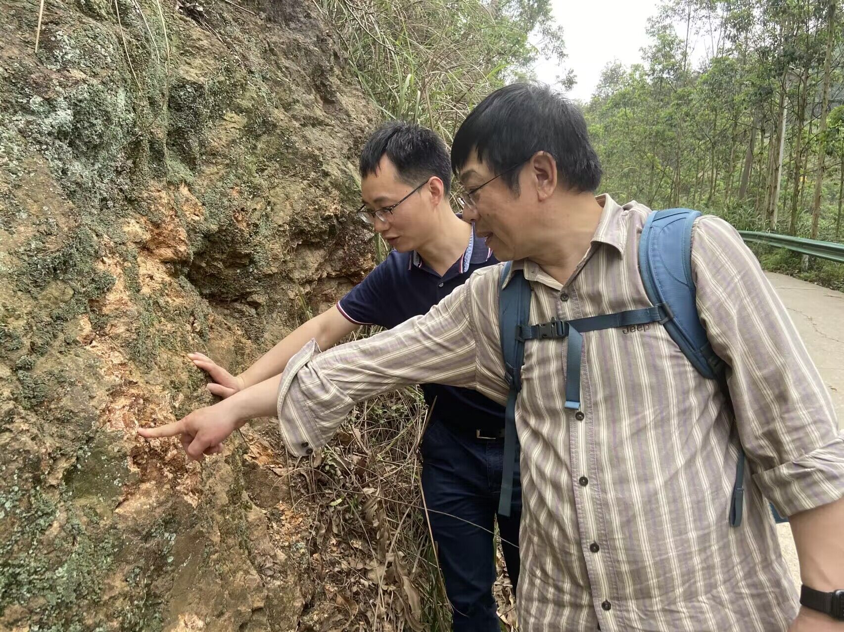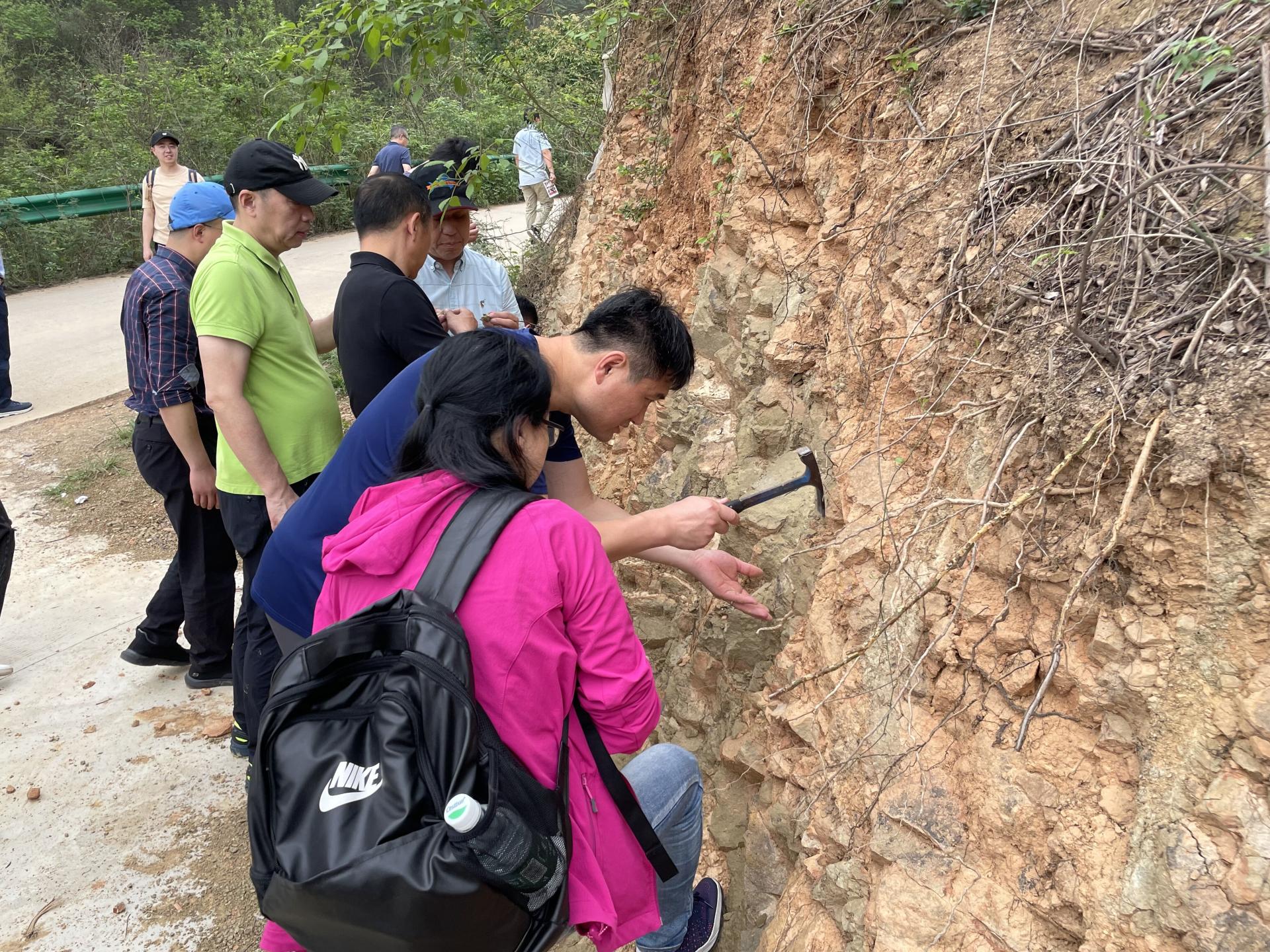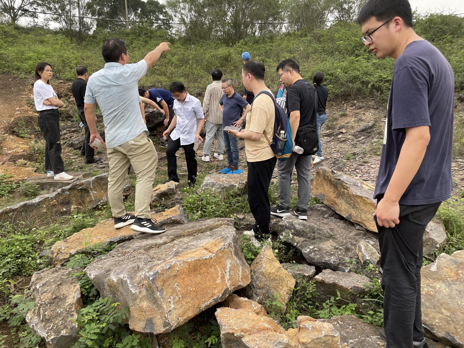 22日下午,在校友的带领下,学院教师考察了横州市六景霞义山泥盆系剖面。六景霞义山泥盆系剖面是我国乃至世界著名的泥盆系标准剖面之一,剖面位于区域性北东向高峰-昆仑关背斜南翼及南侧核部,出露地层有寒武系、泥盆系、古近系和第四系。泥盆系地层单元中古生物化石、生物遗迹、浊流沉积构造等地质现象十分丰富,含有多种岩相组合,其沉积环境与沉积相经历了从滨海相沉积→浅海相沉积→半深海斜坡相沉积→碳酸盐台地边缘生物礁滩相沉积→陆棚到半深海斜坡相沉积→浅海台地相沉积演变,较完整地记录了泥盆纪时期六景从滨海、浅海到半深海陆棚、斜坡再演变成为碳酸盐台地和台地边缘礁滩的整个地质历程,演变过程阶段明显、清晰,是研究华南泥盆时期海侵还退、海平面变化和沉积古环境的典型代表剖面,也是国内外研究古生物学、地层学、岩相古地理学和古生态的理想场所。