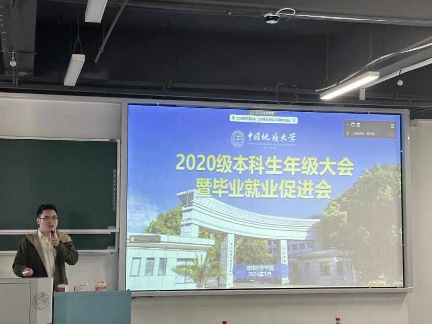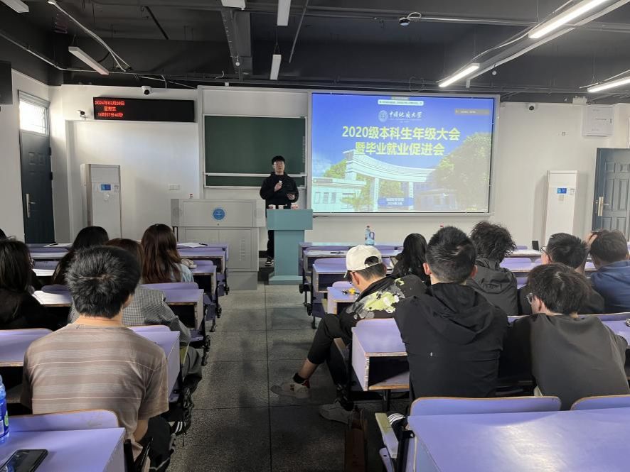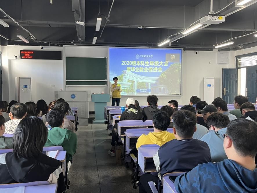 辅导员蒋钰鑫以“健康、毕业、读研、就业、规矩”十个字,从以上五个维度针对年级不同群体的学生做了专项提醒和督促。他重点向同学们强调了按时推进毕业论文和守规矩的重要性,并对现在的读研、就业状况做了详尽讲解,督促提醒同学们务必紧抓考研调剂、“金三银四”就业黄金期等重要时间节点,力争毕业前同学们都能找到自身心满意足的人生“下一站”。